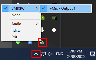 Open the NewTek NDI Webcam Input program that comes installed with the Newtek NDI Tools pack. Once running, click the arrow in the task tray at the bottom right of Windows and right click the yellow and black NDI icon. Select your computer name -> then select vMix - Output 1.