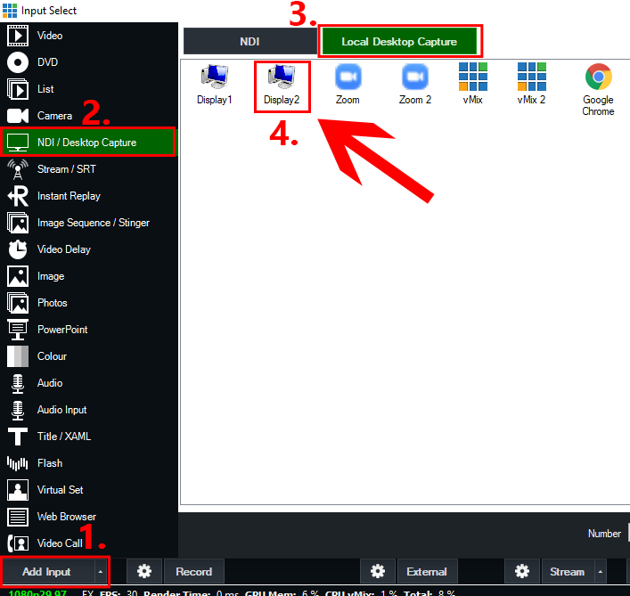 Once your guests have joined your Zoom meeting, we can now add them into vMix. To add the video, select the Add Input button from the bottom left corner. Then select the NDI / Desktop Capture tab. Choose the Local Desktop Capture button from the top. From here, we need to select the corresponding display number that you have Zoom currently displaying on. If you have two monitors, this will usually be Display2. Select the Display2 option and press OK. (Note: Do not select the Zoom program option as direct capture is not supported).