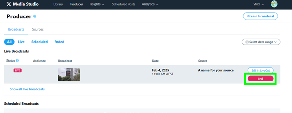 Head back to the X Producer page and you should see your video preview come through. If you’re happy with your preview, click Create Broadcast