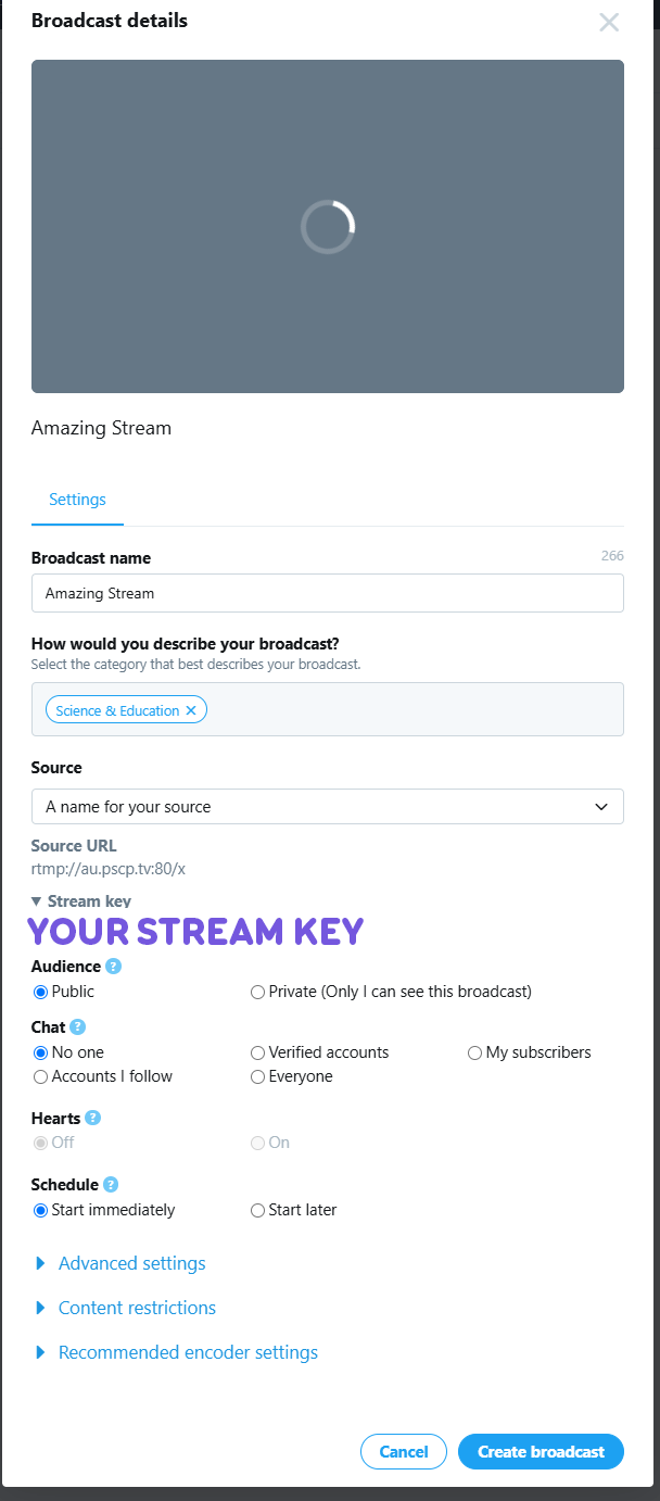 Give the stream a name and category. Then you’ll need to select the source that you want to use. This is the source that was created in step 4. Once that is completed you can choose the privacy, Chat, Hearts, and Schedule.