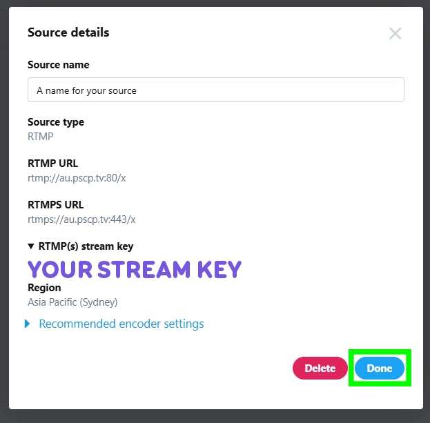 This screen will then populate with the Stream Source URL and Stream Key that you need to enter into vMix whenever you want to use this source. Click Done.